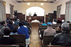 蝋燭の火を灯した中でのクリスマス礼拝。救い主イエス・キリストの誕生を一緒にお祝いしよう。大人から幼児まで誰でも参加可能。礼拝後に食事を兼ねたお祝いの会あり。